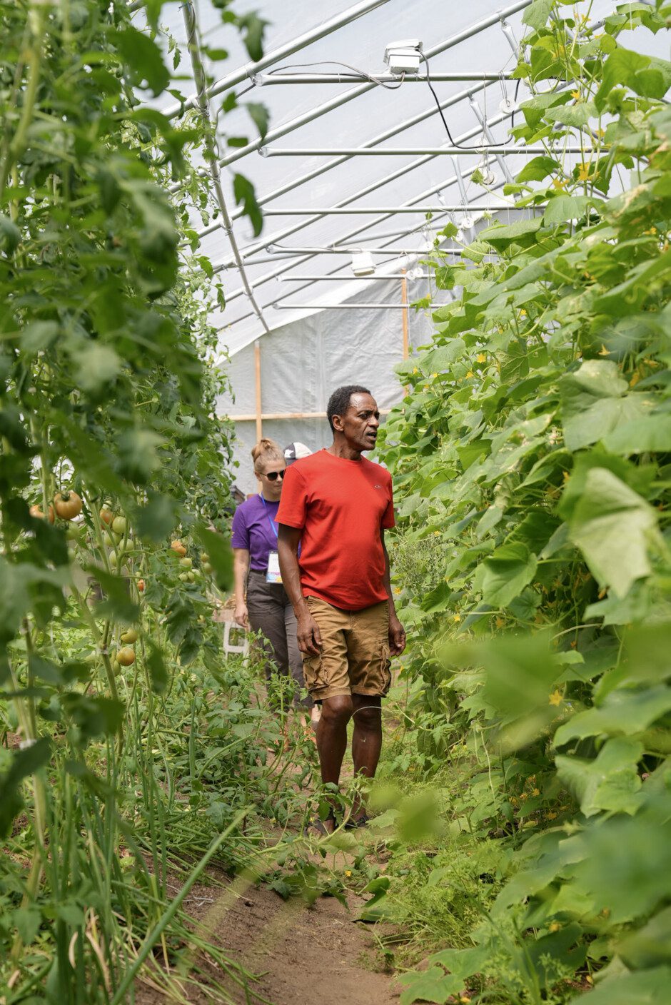 Students plant seedlings at the farm.Sienna Viette teaches students about mushroom inoculation.Sienna Viette and Sister Anna Gilbert-Muhammad serve food to students during a field trip to Open fArms Retreat,Andraly Horn inspects plants in the greenhouse.Students prepare their seedlings for planting.